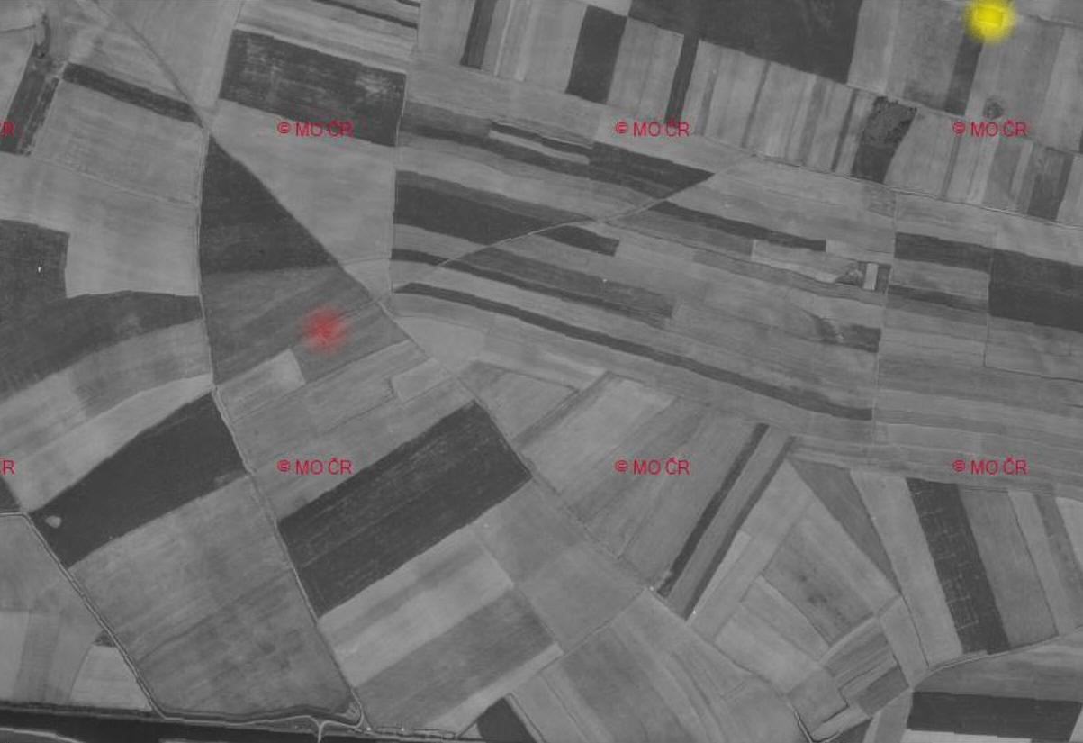 Asi 31.3.1945 nouzové přistání Bf 109 K-4 WNr. ???186 od II./KG (J) 6 z Klecan. Letoun už nebyl odklizen. Letecká badatelna. Ortofotomapa 3.5.1946.