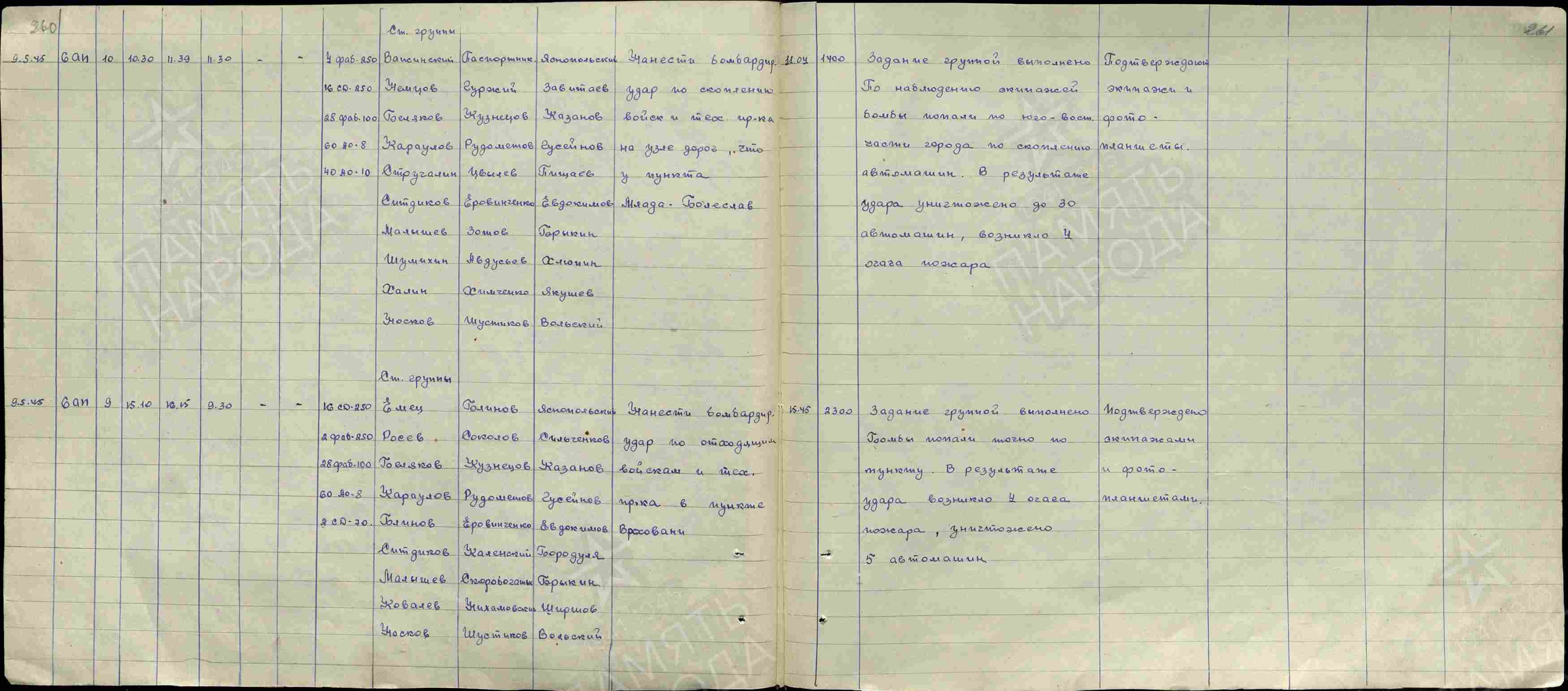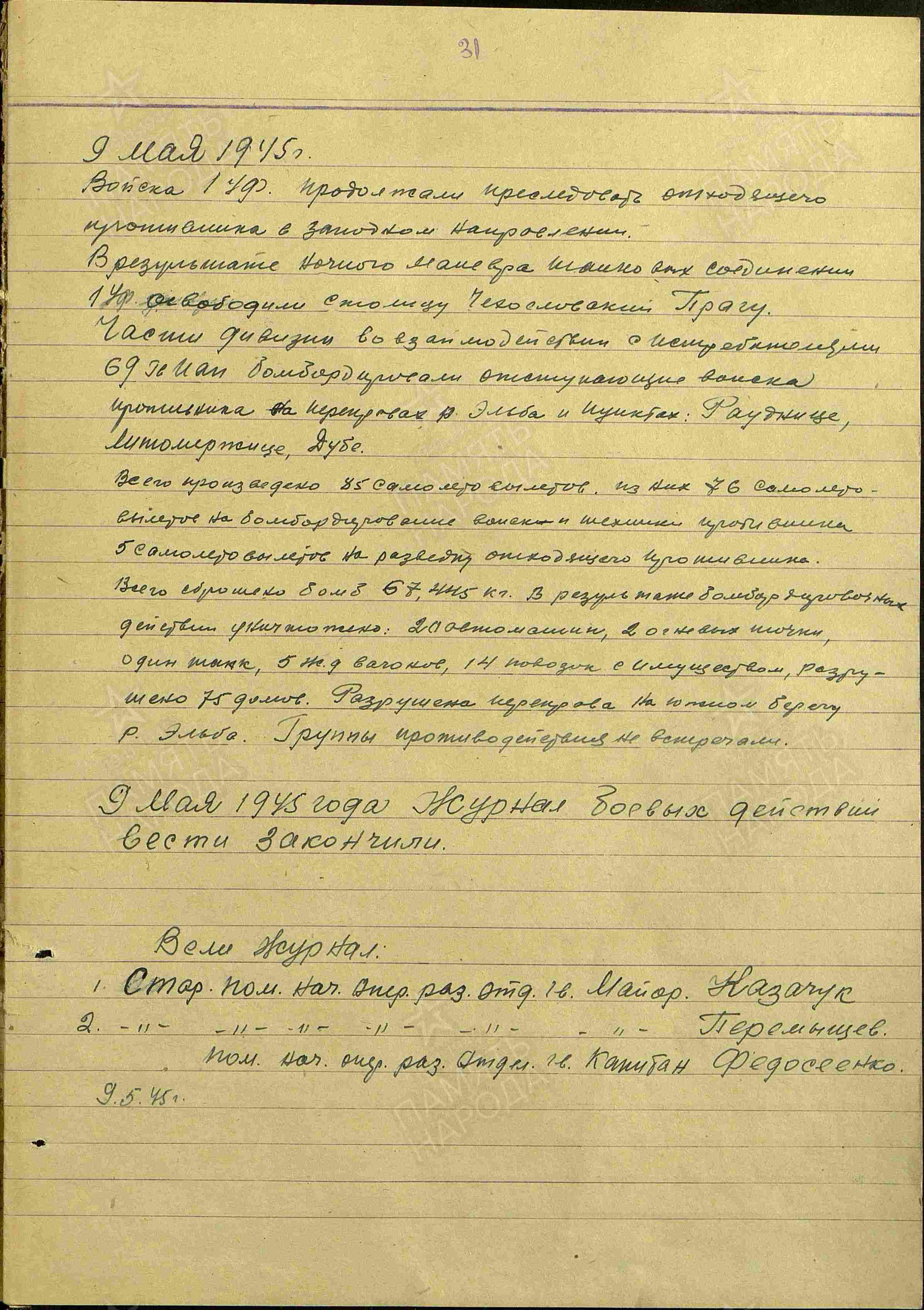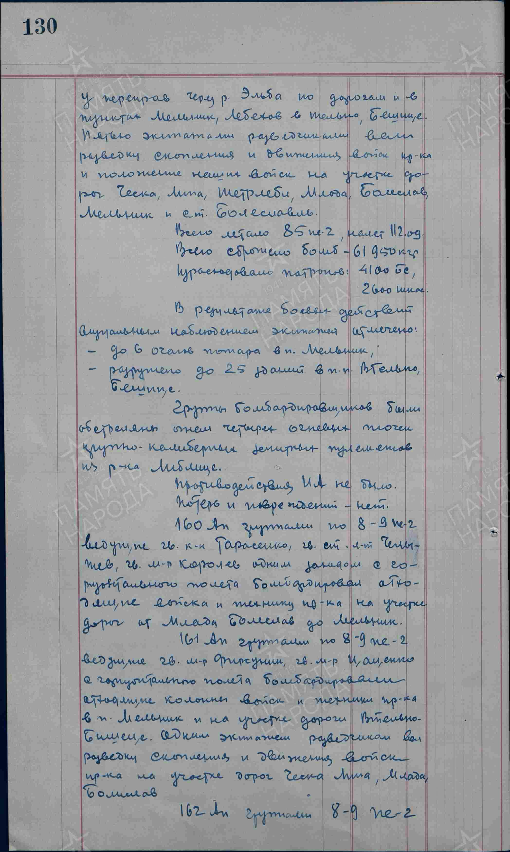 Podřízený 161 гбап ? s 8-9 Pe-2 vedoucí: gardový major ?ersuniš, gardový major ?, V) z horizontálního letu bombardovali ? kolony vojska a techniky protivníka ve městě Mělník a na úseku silnice ? Byšice. ? posádek průzkumníků vedlo průzkum shluků ? ? protivníka na úseku silnice České Lípa, Mladá Boleslav.