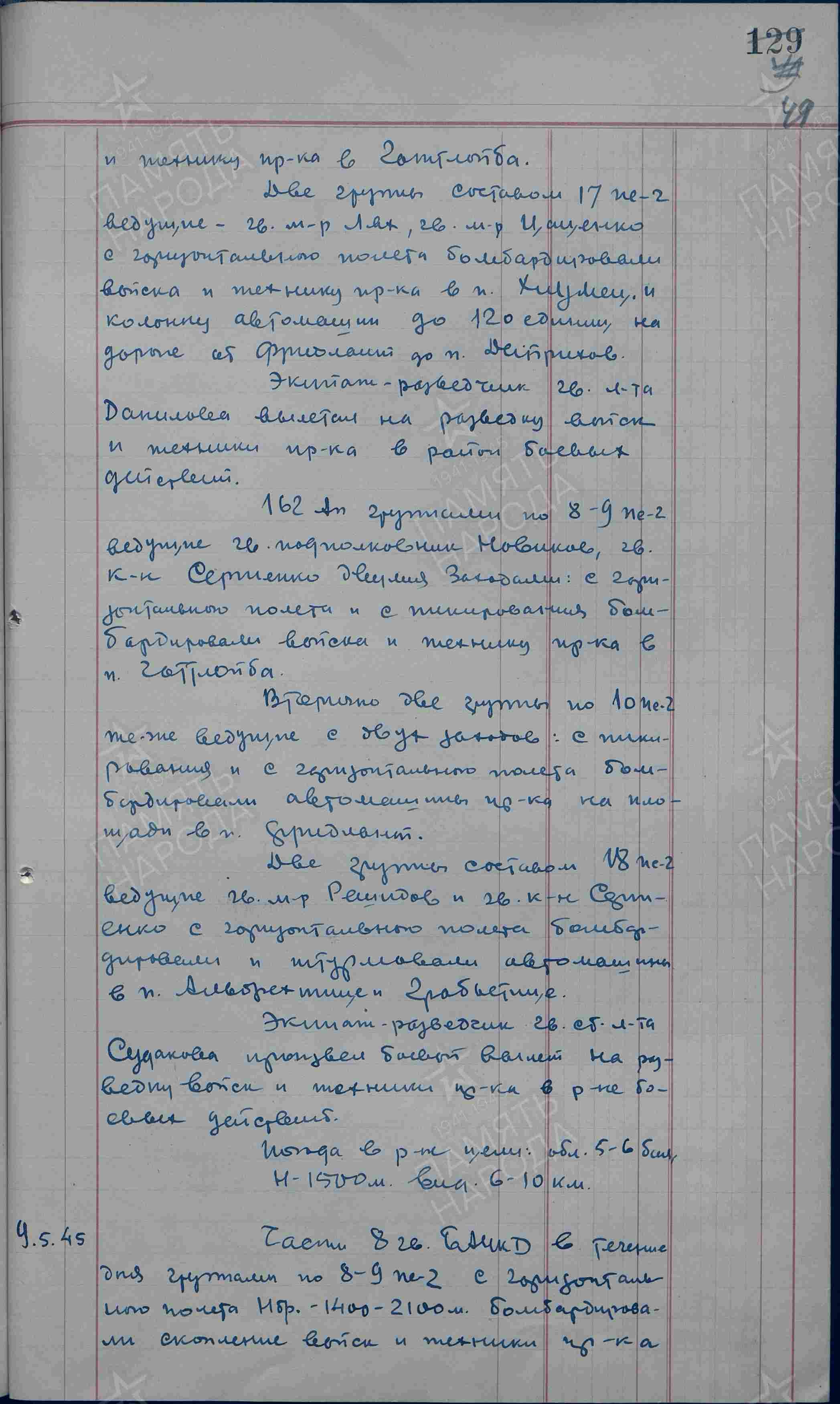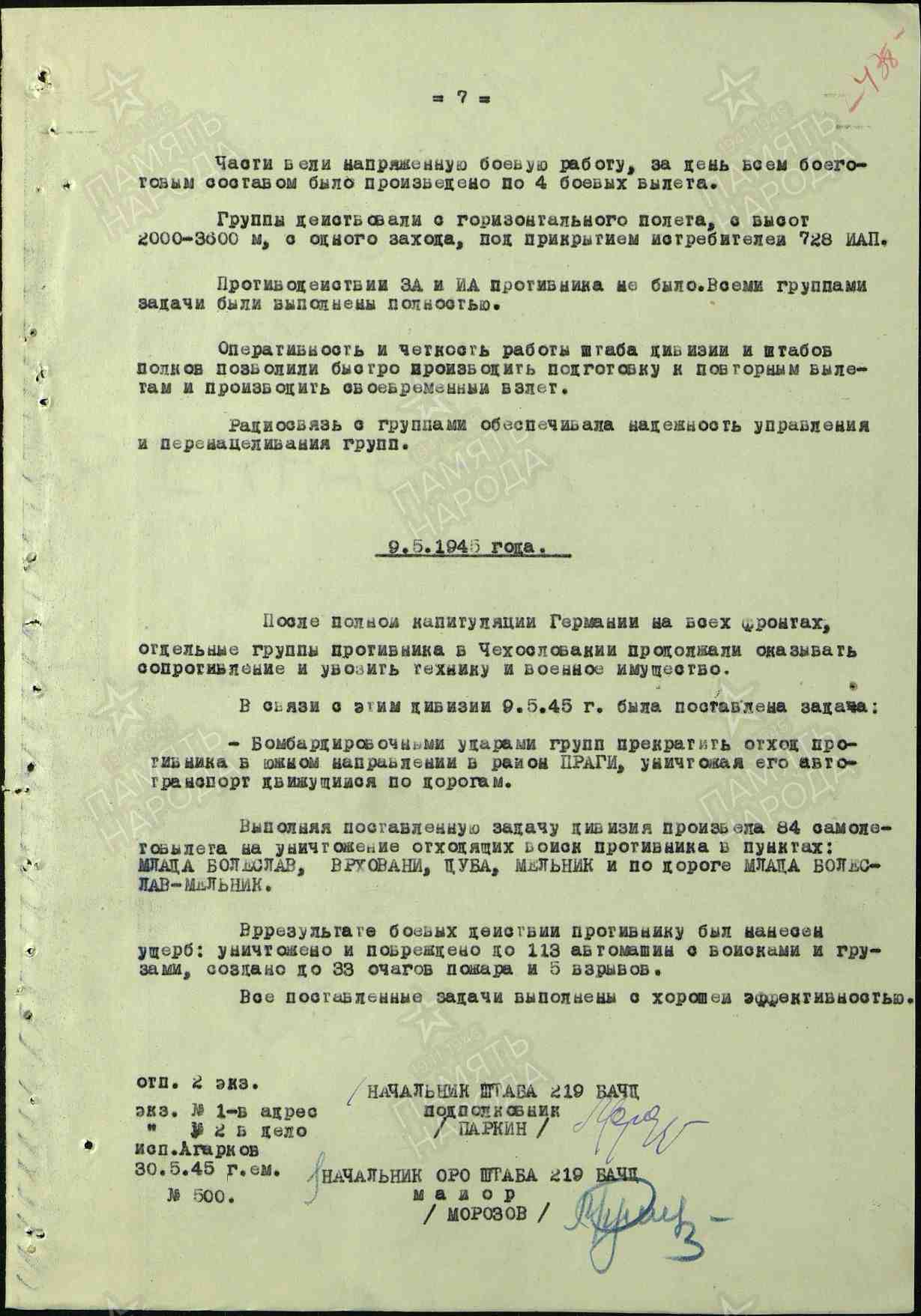 Podřízený 160 гбап ? s 8-9 Pe-2 (vedoucími gardový kapitán Tarasenko, gardový stáršij lejtěnant Gelyšev, gardový major Koroljov Матвей Григорьевич Королёв, jedním průletem z horizontálního letu bombardovali ? vojska a techniky protivníka na úseku silnice od Mladé Boleslavi po Mělník.