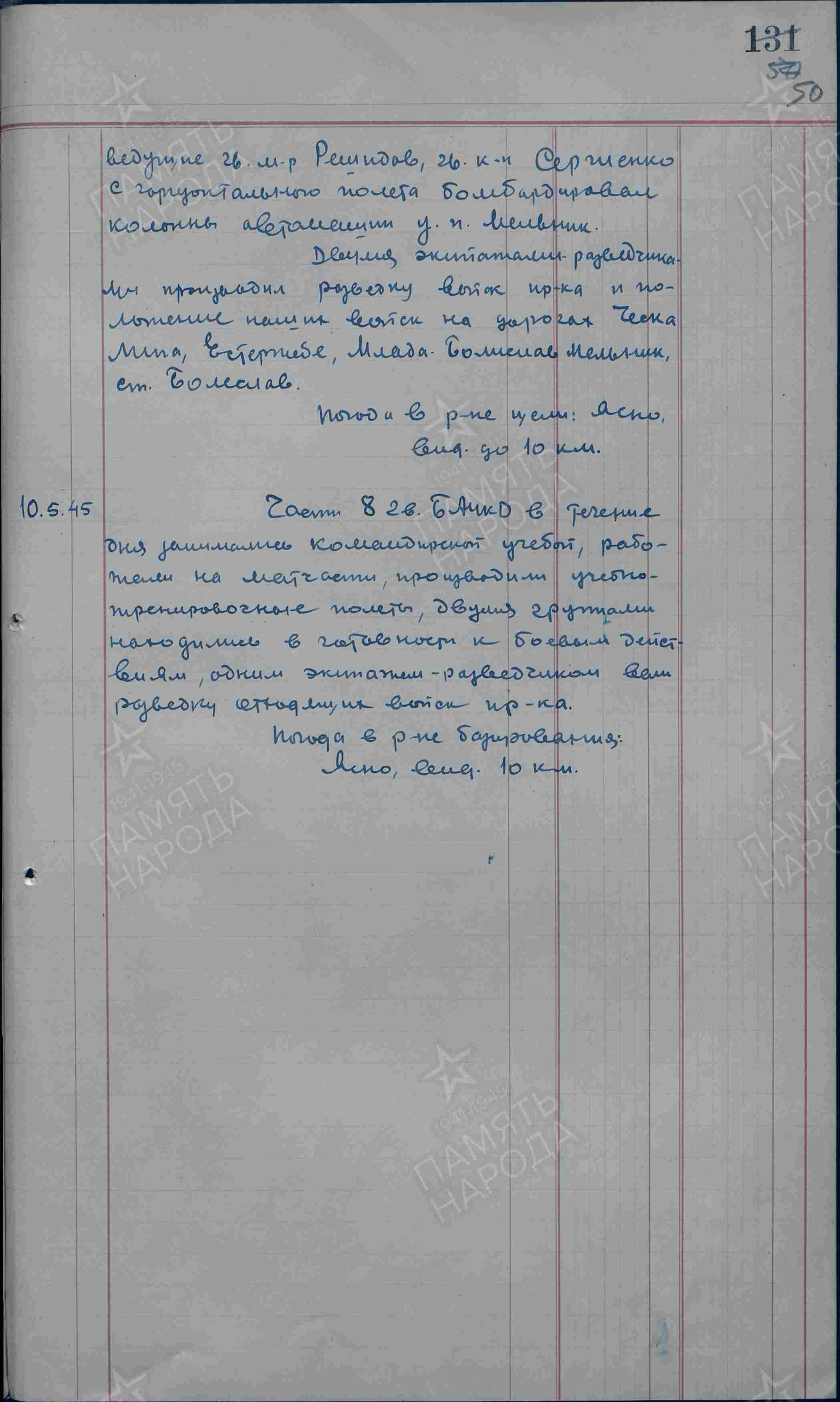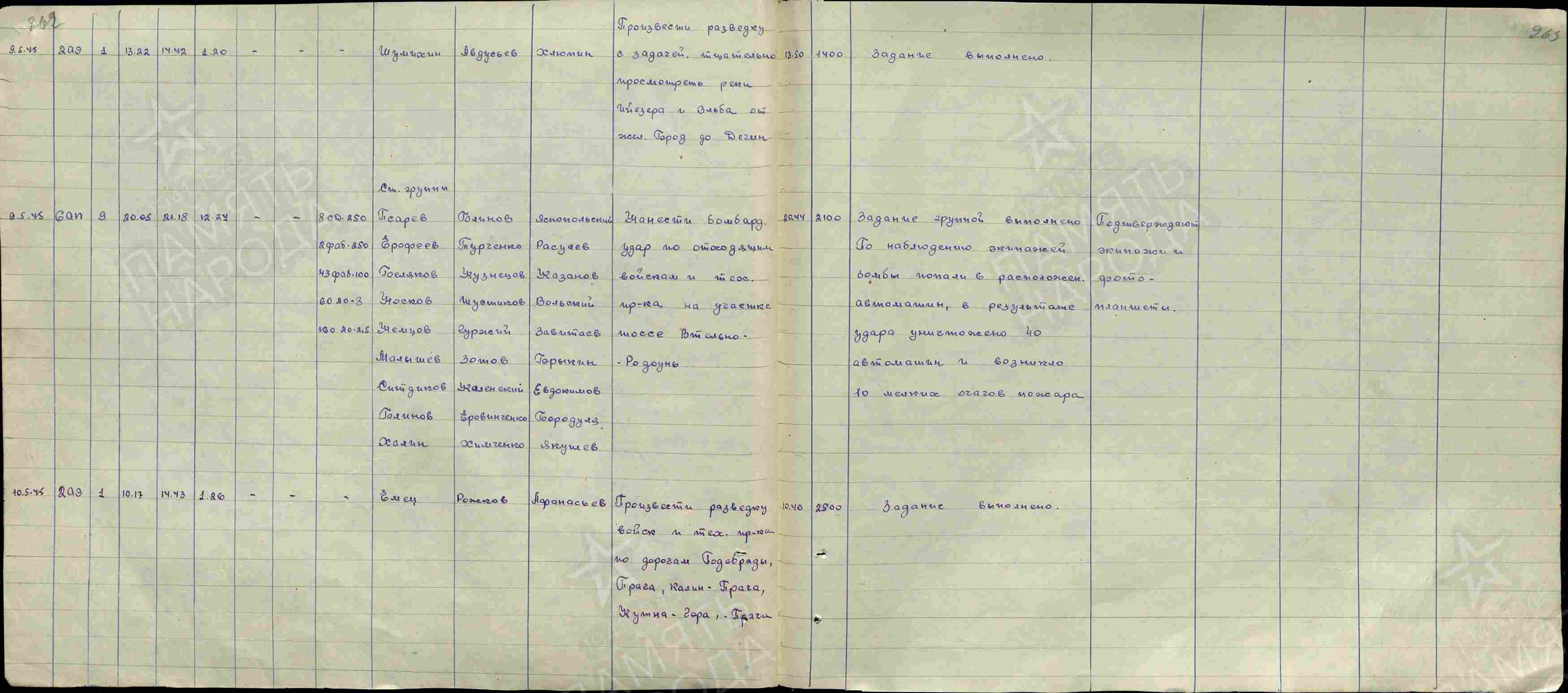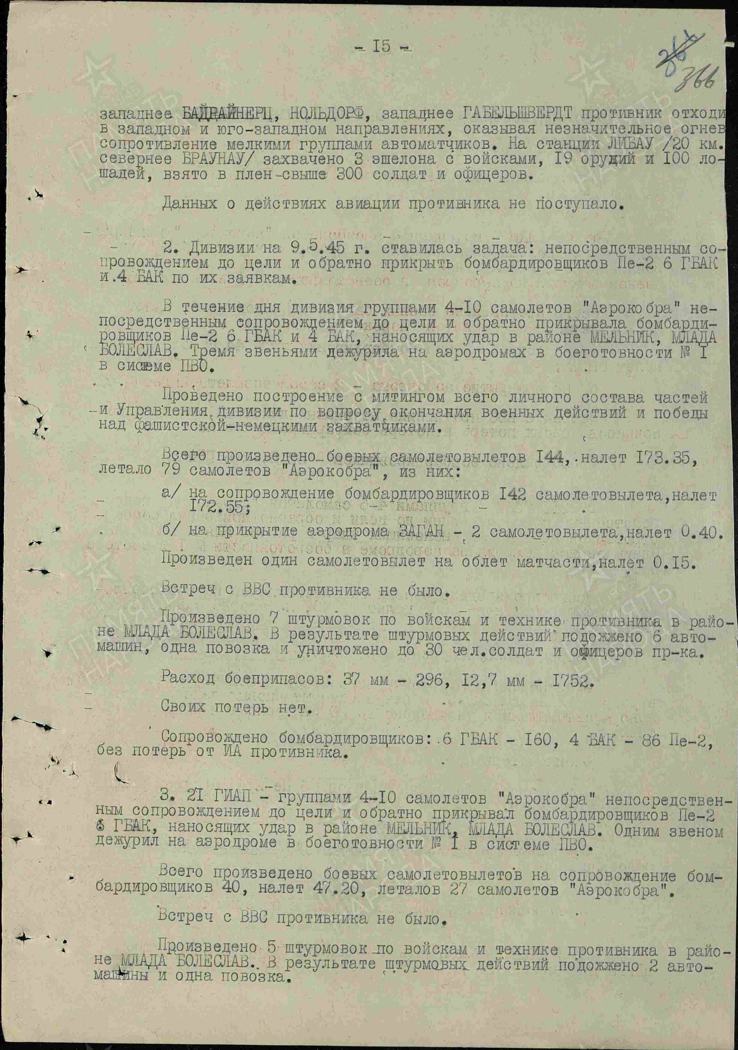 10.5.1945 od 8.30 do 12.00 hod. moskevského času 4 šturmoviky od 3 шак, 2 ВА a 12 stíhacích Jak-9 od 181 иад, 3 шак, 2 ВА provádělo průzkum od Liberce na Českou Lípu a dále na jih a jihozápad. Deník bitevního korpusu.