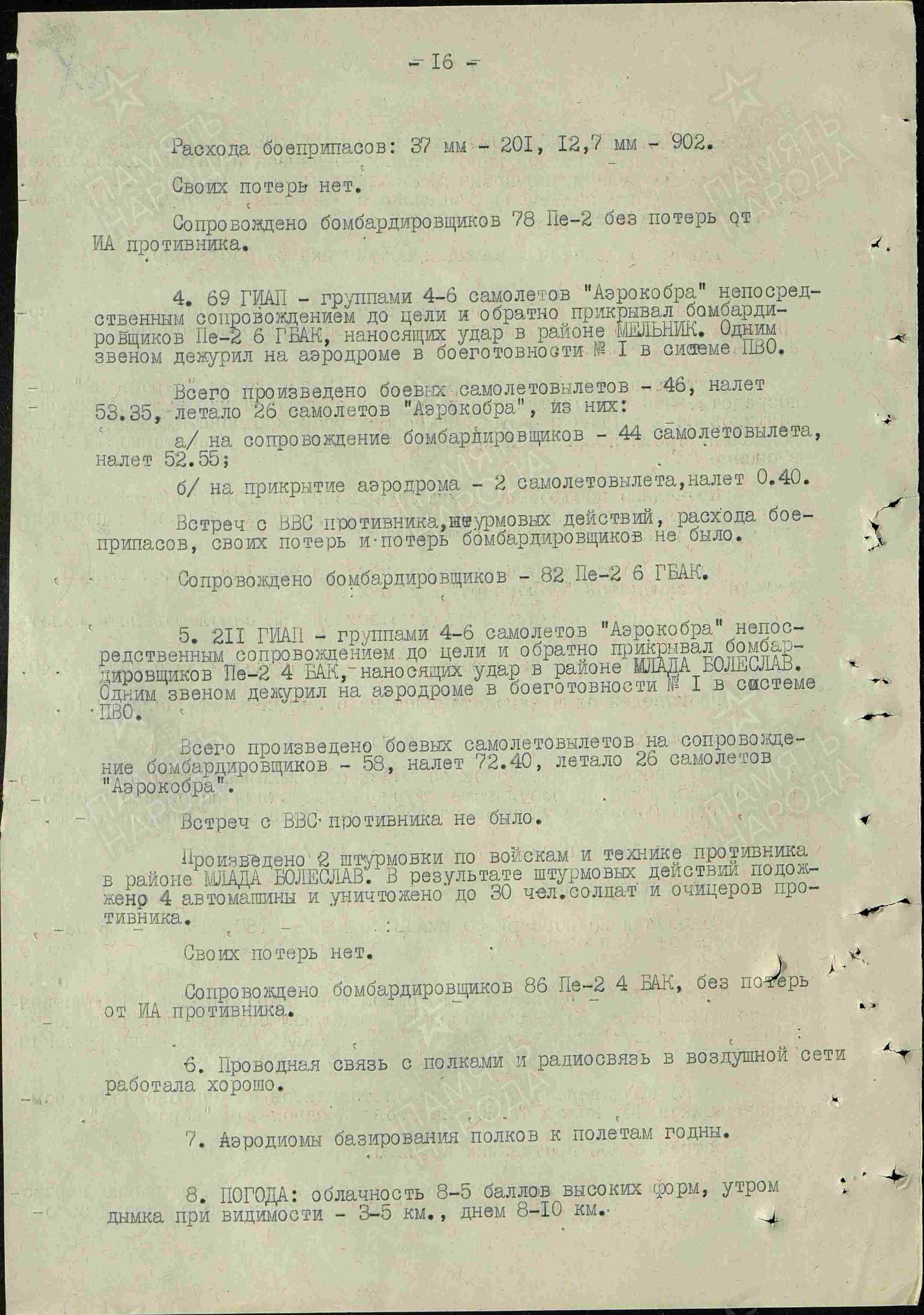 211 гиап. Celkem 58 letů na doprovod bombardérů nad Mladou Boleslav. V okolí Mladé Boleslavi provedeny 2 útoky po vojsku a technice protivníka stíhačkami P-39 Airacobra. Zapáleny 4 auta a zničeno do 30 vojáků a důstojníků protivníka.